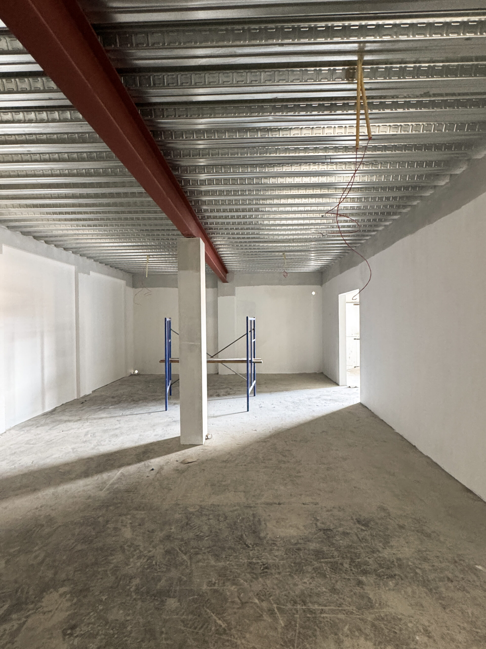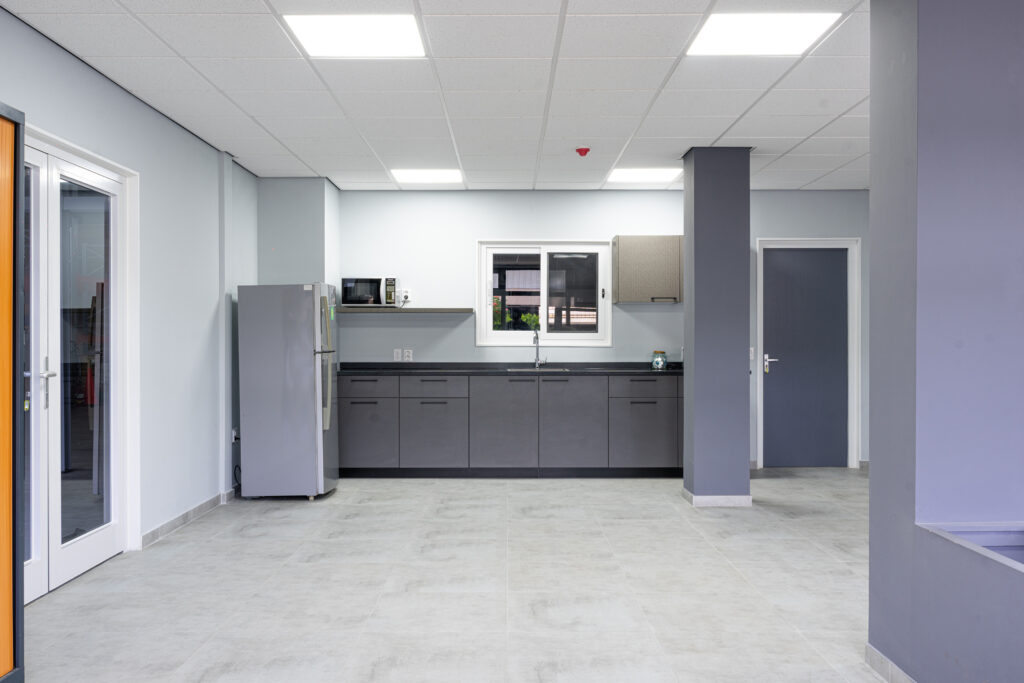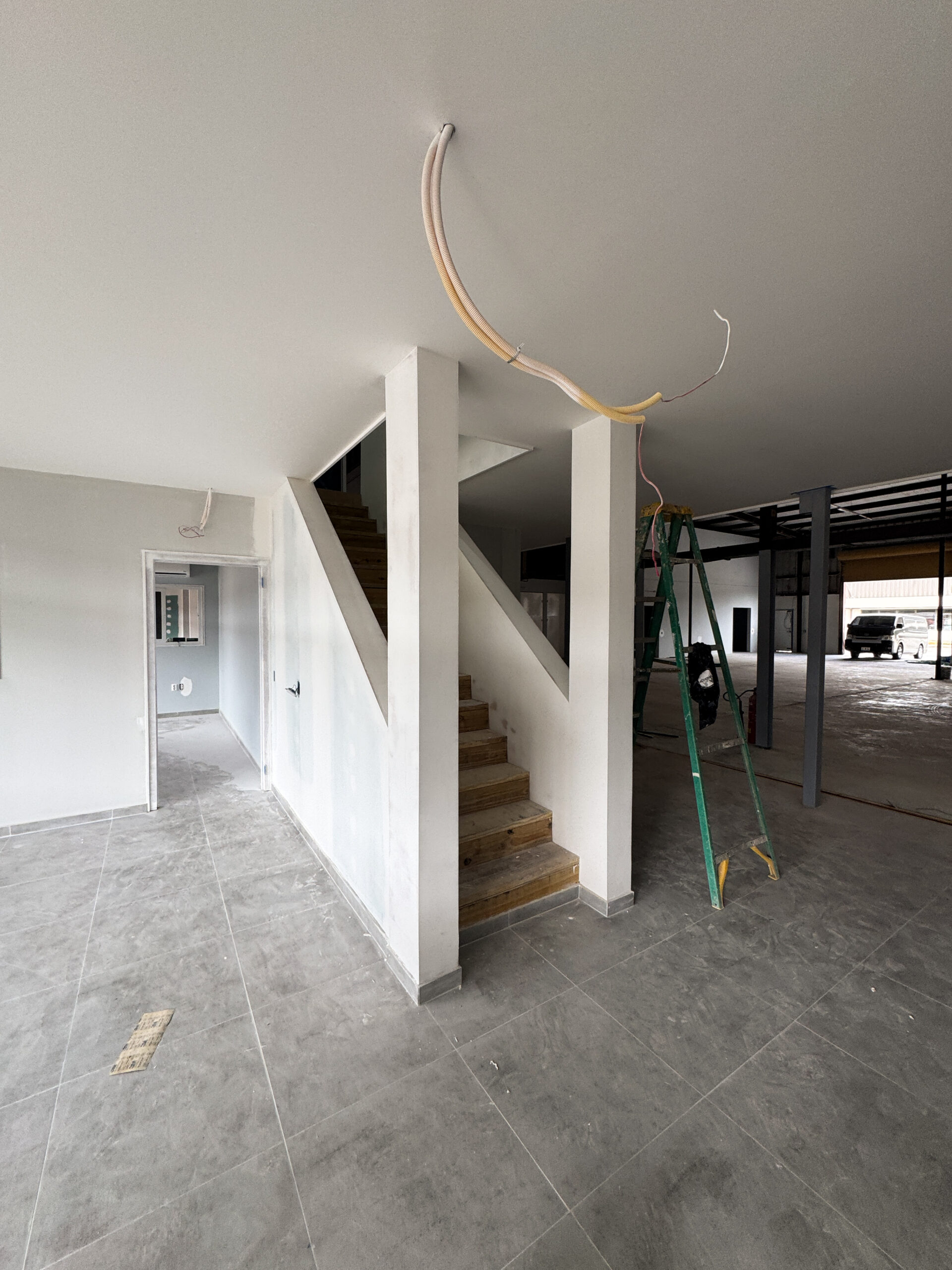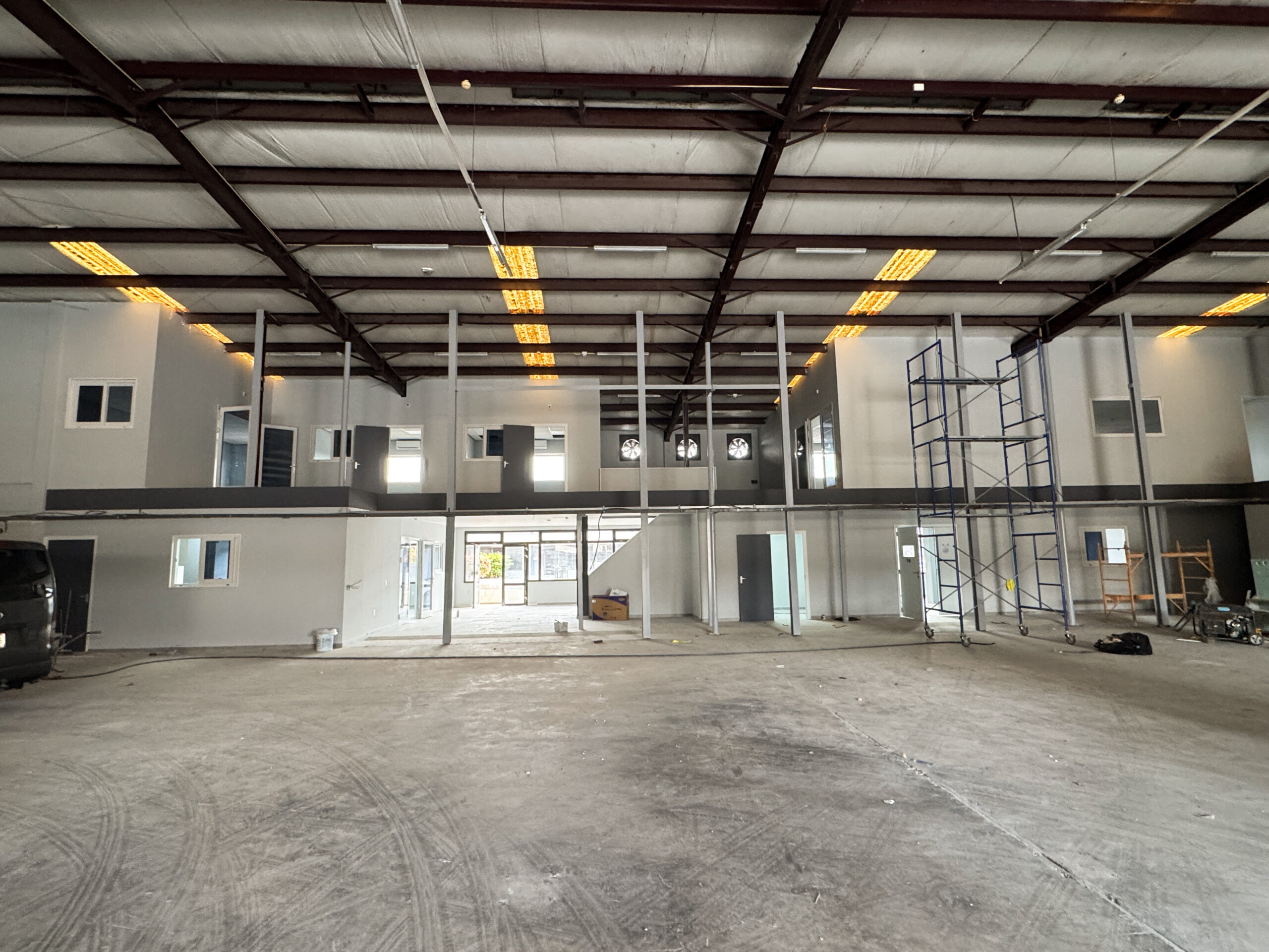 As part of the ground‑floor finishing, 60×60 cm floor tiles were installed. This presented a challenge due to the uneven condition of the existing warehouse floor. Despite this, the installation was successfully completed, resulting in a clean, durable, and professionally finished tiled surface.