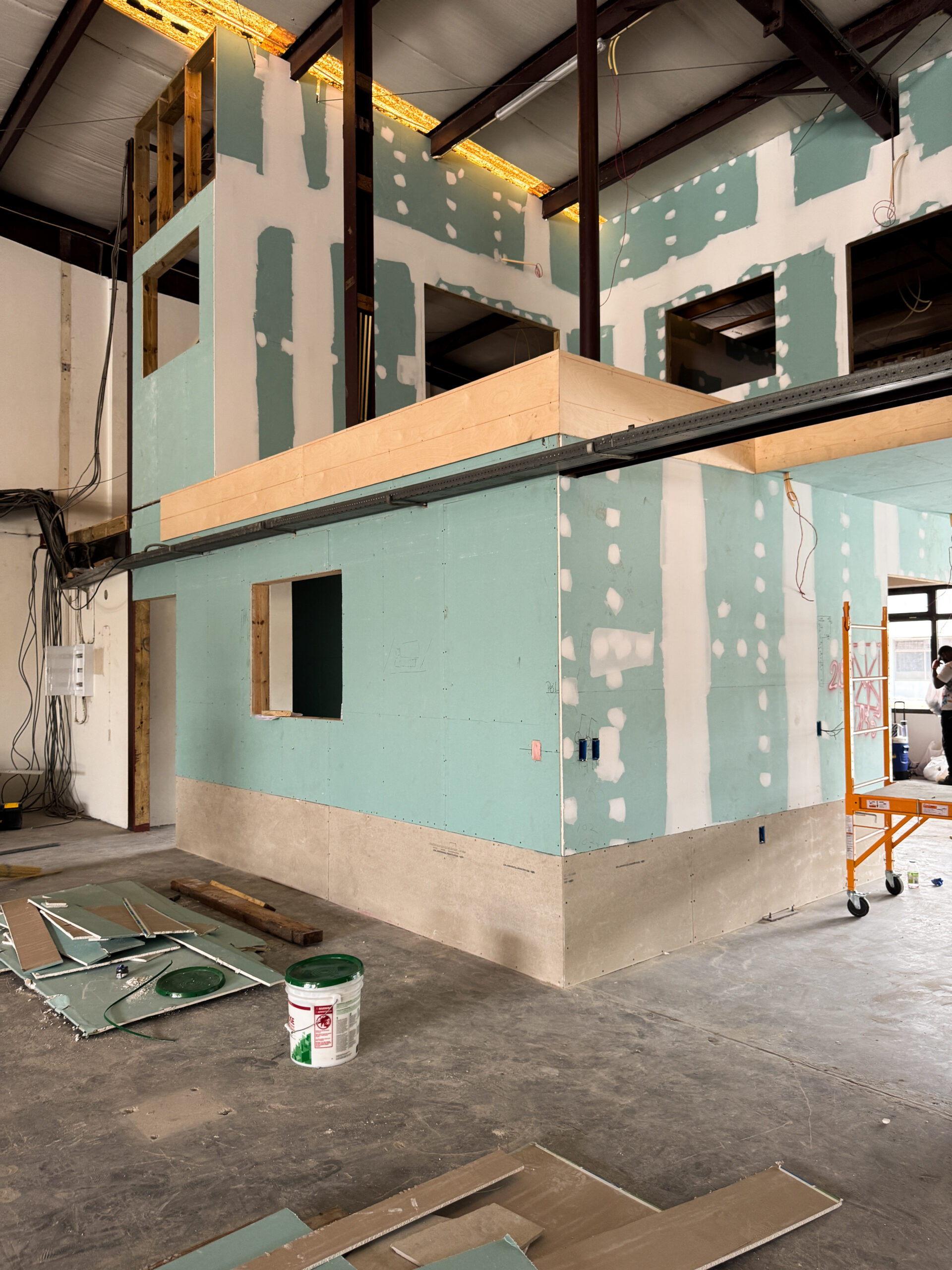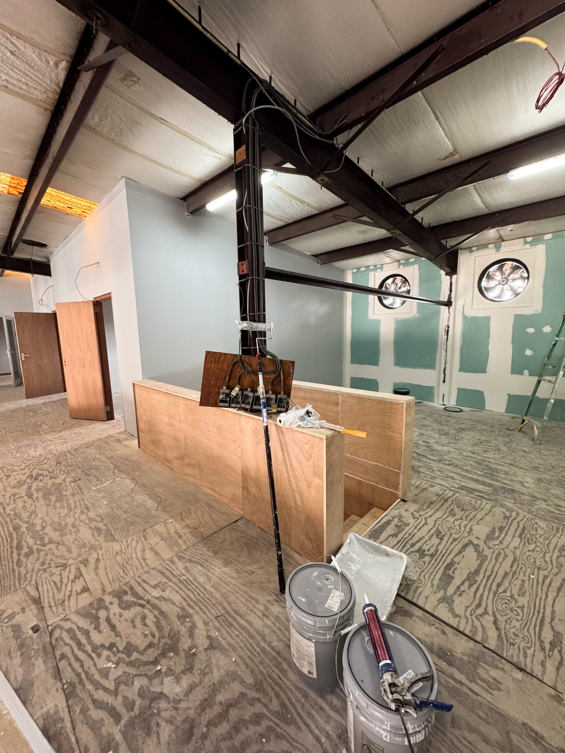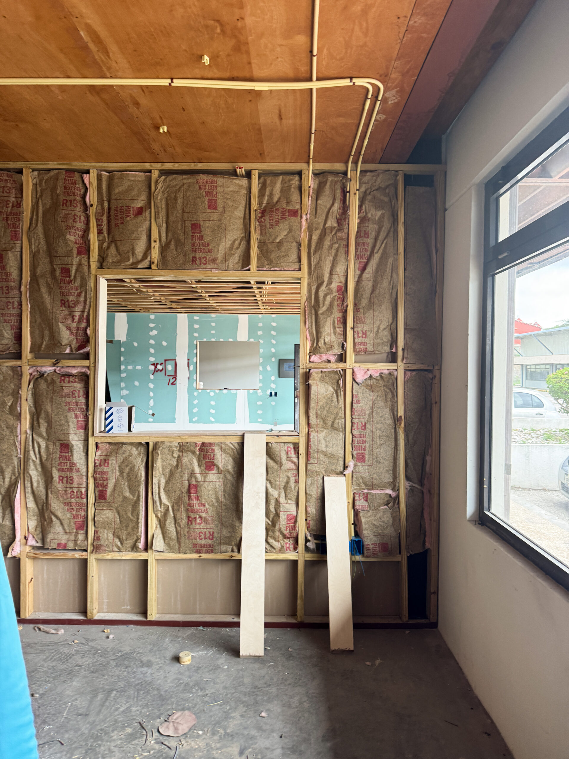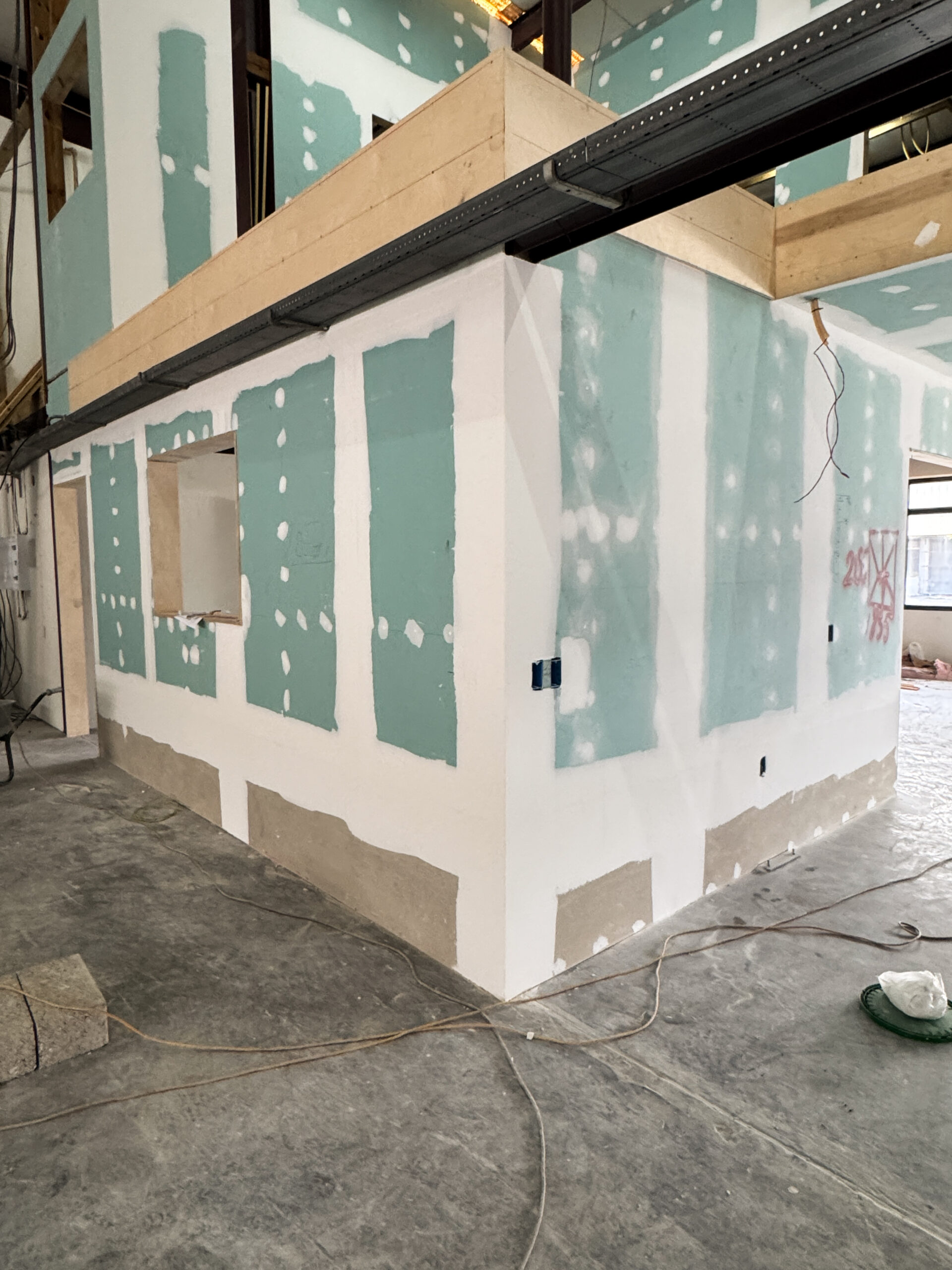 The intention for this construction was to use a partition wall system, allowing the creation of flexible and easily adjustable interior spaces. All office walls were finished with gypsum board and insulated using Owens Corning PINK Next Gen Fiberglass R‑13 Kraft (3‑1/2 in., 23×93 in.). This insulation was essential to prevent sound transmission between rooms and to maintain proper cooling within the office areas. The walls were completed to a high professional standard.