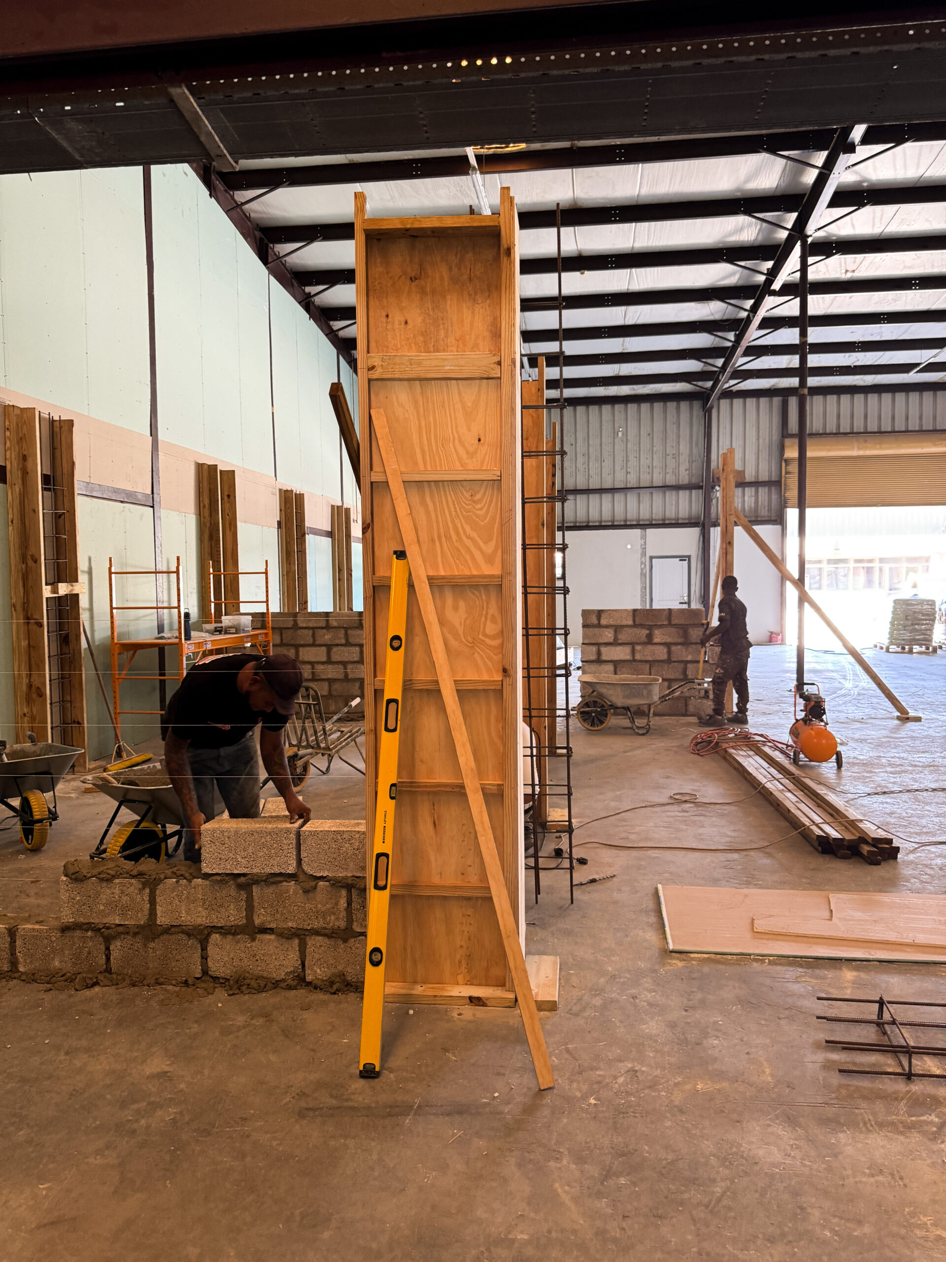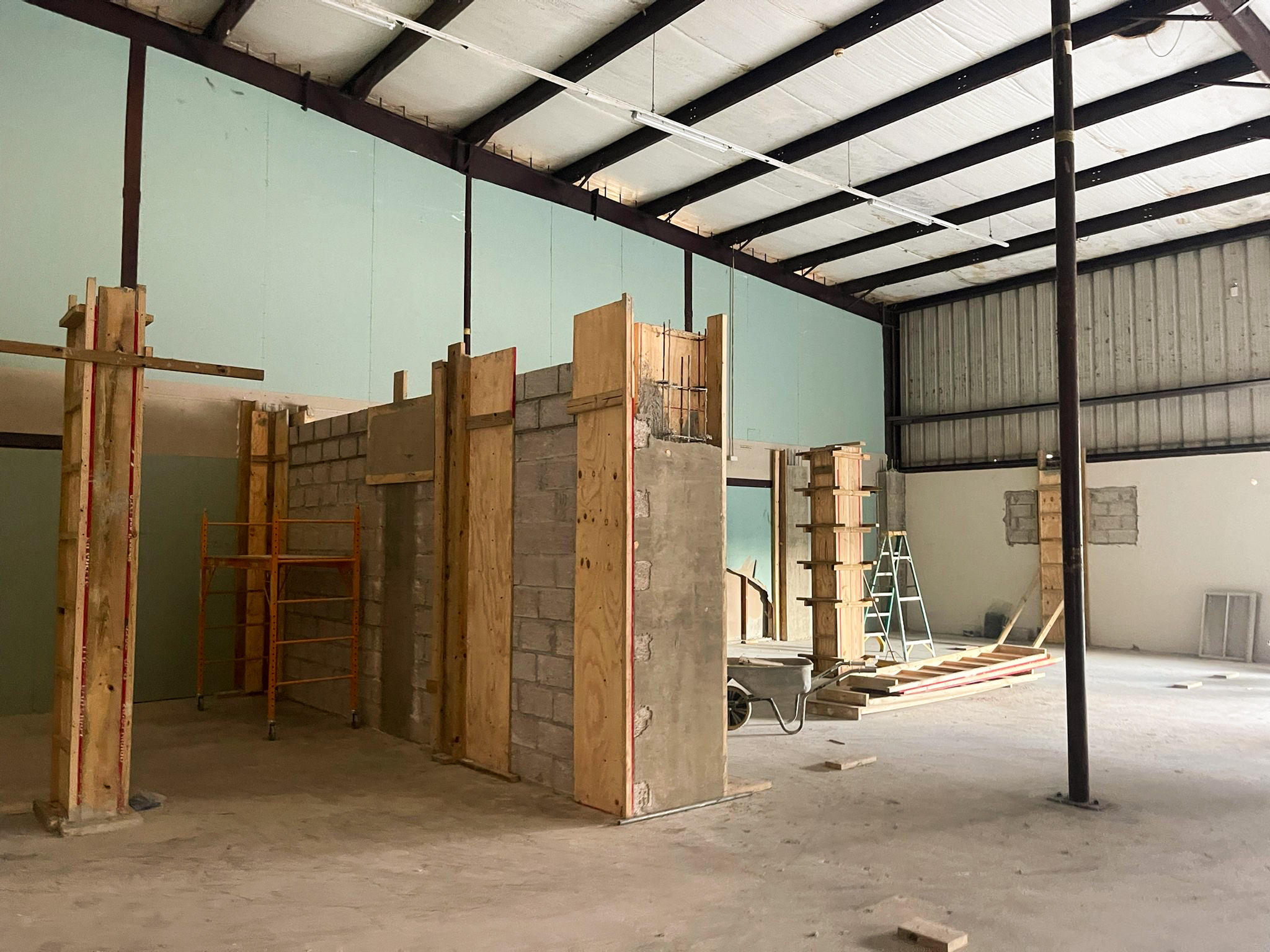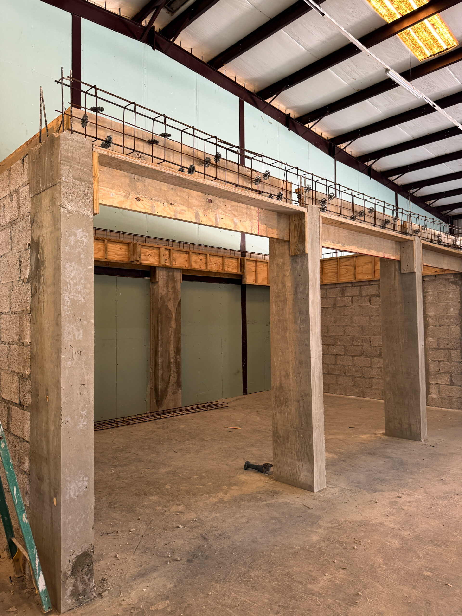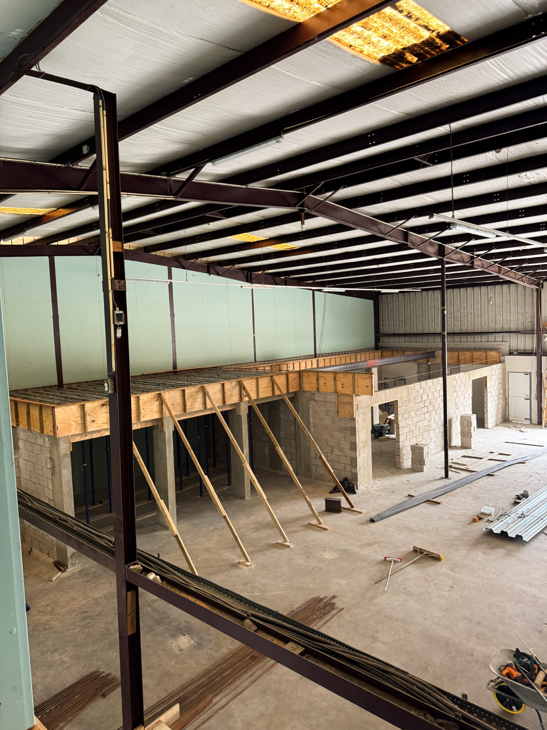The cooled area (a 24/7 climate‑controlled space) required a different structural approach. This section had to be built using concrete masonry blocks to support a reinforced concrete slab above, which would serve as an additional storage level for the company. For this purpose, 6‑inch concrete blocks were used, combined with cast‑in‑place concrete columns and a Superfloor system installed on top. (See cooled area photos.)